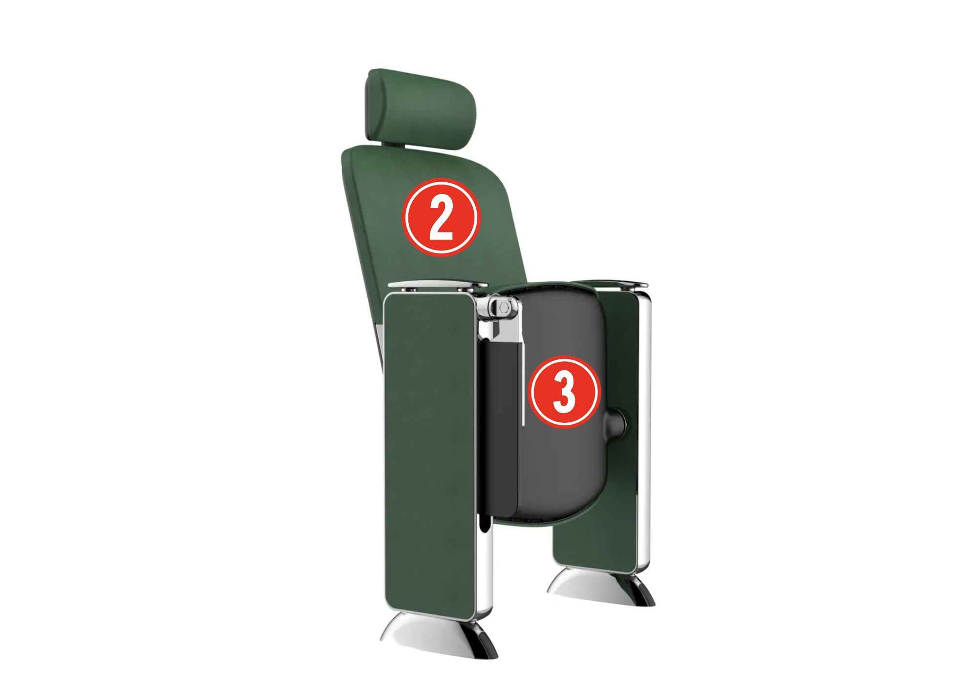 ② & ③ Seat and backrest sponge: High-density PU, molded through cold foaming.